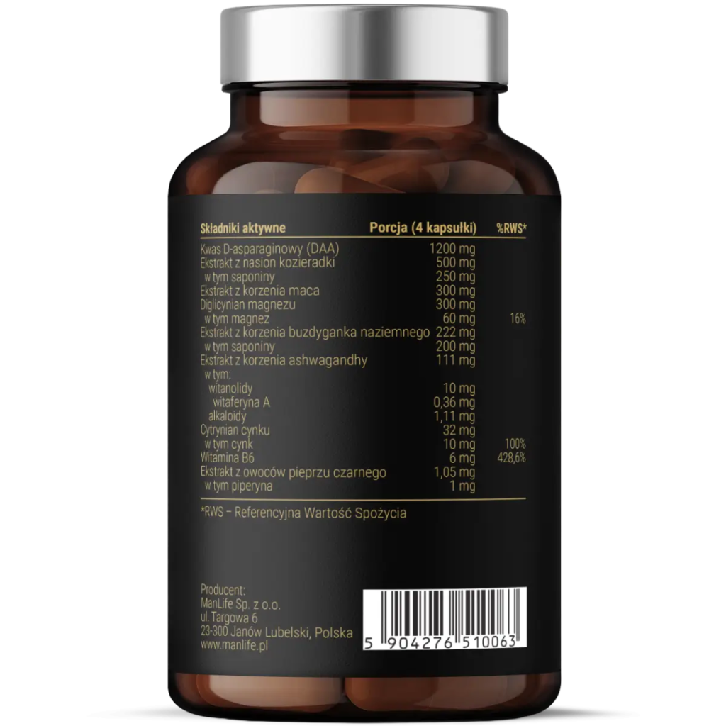 Kwas D-asparaginowy (DAA), ekstrakt 4:1 z nasion kozieradki (Trigonella foenum-graecum) standaryzowany na zawartość 50% saponin, ekstrakt 10:1 z korzenia maca – pieprzycy peruwiańskiej (Lepidium meyenii), magnez (diglicynian magnezu), ekstrakt 12-15:1 z owoców buzdyganka naziemnego (Tribulus terrestris) standaryzowany na zawartość 90% saponin, ekstrakt 5:1 z korzenia ashwagandhy (Withania somnifera) standaryzowany na zawartość 9% witanolidów, 1% alkaloidów, 0,32% witaferyny A; cynk (cytrynian cynku), inulina, witamina B6 (chlorowodorek pirydoksy- ny), ekstrakt 25:1 z owoców pieprzu czarnego (Piper nigrum) standaryzowany na zawartość 95% piperyny, otoczka kapsułki: hydroksypropylometyloceluloza.